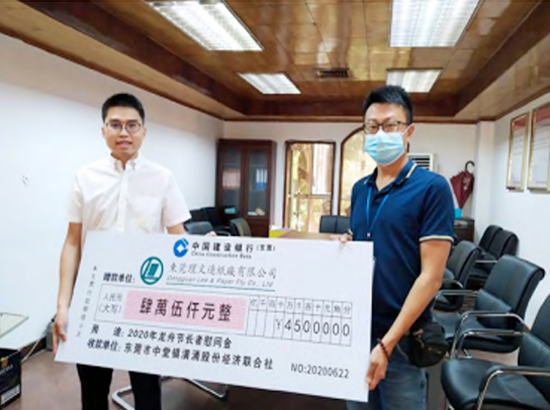 2020年6月24日,東莞理文造紙廠負(fù)責(zé)人代表公司管理層,向中堂鎮(zhèn)潢涌村委捐贈了價值45000元、重達(dá)1.5噸的愛心扶貧農(nóng)產(chǎn)品優(yōu)質(zhì)大米,用于潢涌村年滿60周歲的2250名長者派發(fā)端午節(jié)愛心慰問。