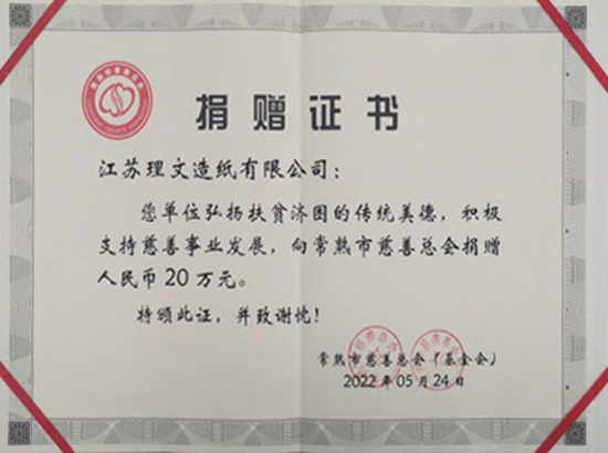 為弘揚(yáng)扶貧濟(jì)困、樂善好施的傳統(tǒng)美德,營造良好的社會慈善氛圍。2022年5月,江蘇理文造紙有限公司向江蘇省常熟市慈善總會捐贈人民幣二十萬元,用于常熟市慈善總會開展慈善活動,此舉體現(xiàn)了公司勇于承擔(dān)社會責(zé)任的精神。