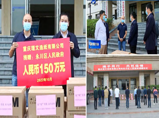 2022年10月31日,重慶理文造紙有限公司向重慶市永川區(qū)捐贈了N95口罩20萬個、防護(hù)服1萬套、隔離服1萬套,價值150萬元的防疫物資和現(xiàn)金,目前這些防疫物資已被送往抗疫一線。重慶理文造紙有限公司對永川抗疫工作的大力支持,全面展現(xiàn)了企業(yè)的社會責(zé)任和擔(dān)當(dāng)。